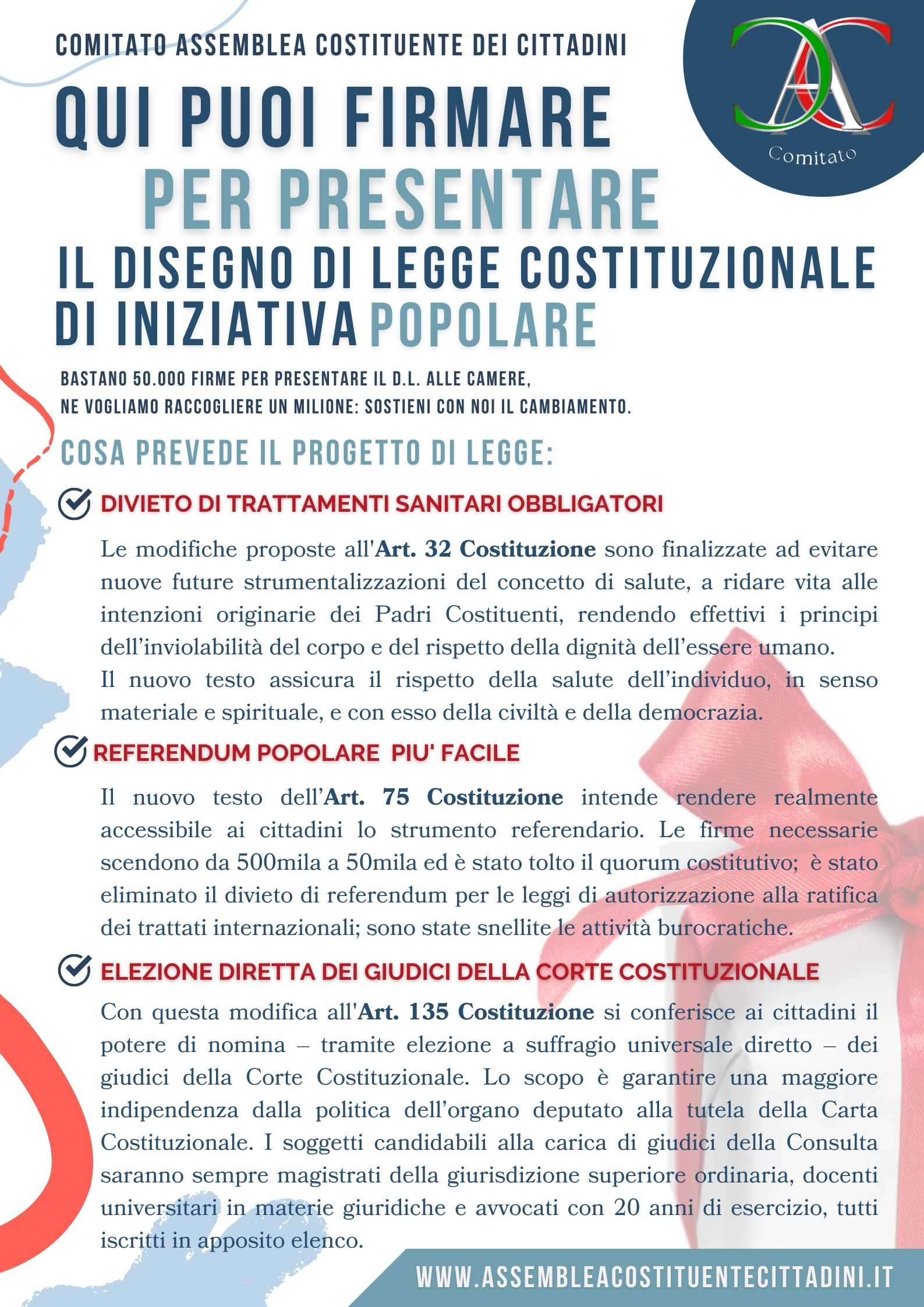 E' possibile da oggi effettuare anche presso questo Ente la raccolta firme per proposta di Referendum Disegno di Legge Costituzionale di iniziativa Popolare.